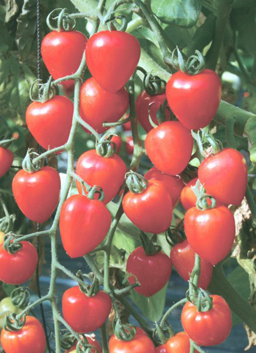 Originale varietà di pomodoro ibrido indeterminato della tipologia Cherry, indicato per coltura in serra, in pieno campo e vaso: una grande novità per forma e sapore. Pianta vigorosa con grappoli ramificati e con frutti di pezzatura uniforme da 15-20 grammi, a forma di fragola, con ottima consistenza e resistenza alle spaccature e con brix elevato. Colore rosso vivo intenso e frutti molto gustosi e dolcissimi.